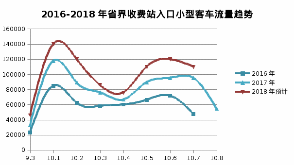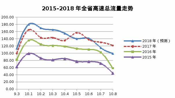 预计今年车流总量将再次突破历史值,但增速将继续放缓,一方面是我省民航系统 “一干八支”机场布局已形成,全省9个市州已有通航机场11个,民航线路逐步加密,将吸引更多省外客流;另一方面高铁网络的不断扩充,沪昆、贵广、渝黔高铁的运营将继续分流公路客运量。预计今年我省国庆期间高速公路车流总量将达到1169万辆左右,日均167万辆,同比上升18%,小型客车占比约90%,货车占比7%。