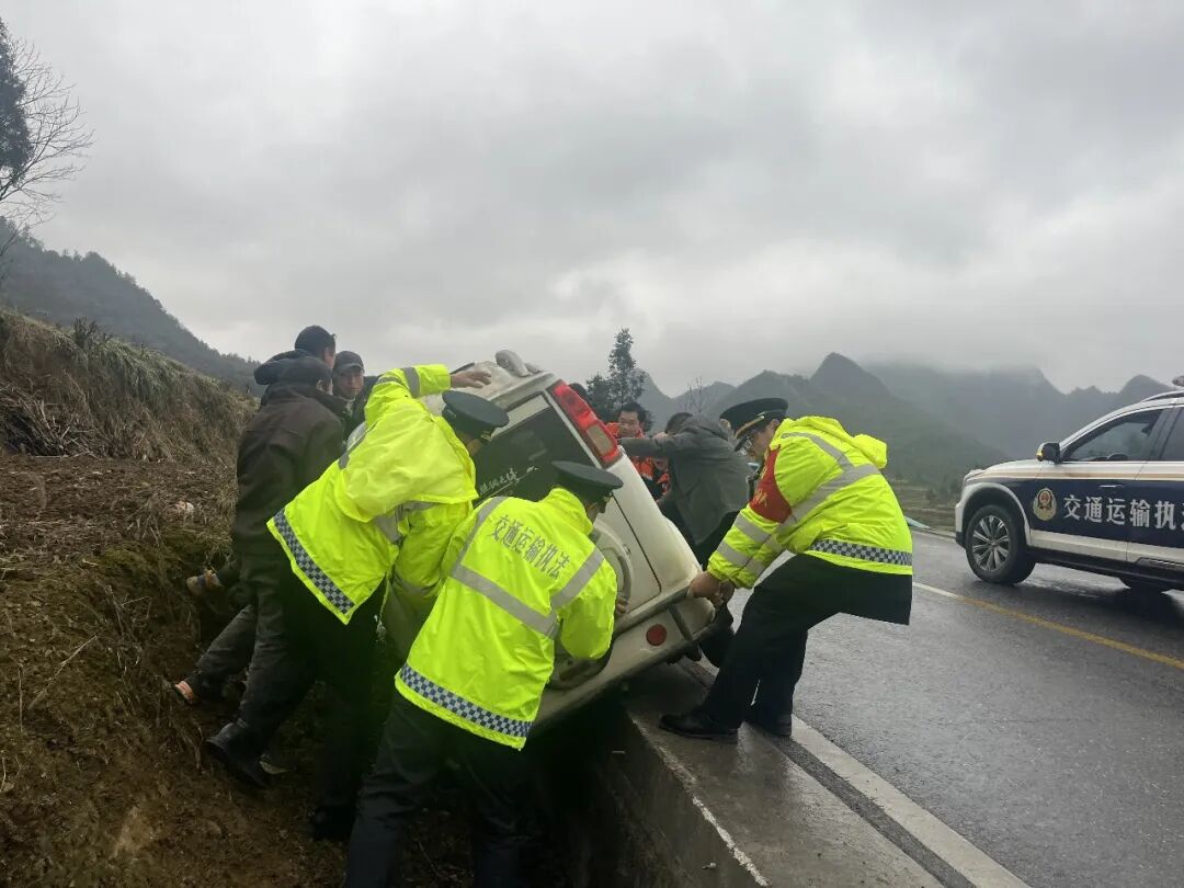 1月20日10时08分,受持续低温雨雪凝冻天气影响,贵州省麻江县境内省道206线K264+000处(小谷硐段)发生一起车辆侧翻事故。贵州省交通运输综合行政执法七支队三大队在例行巡查中发现,一辆小型客车因路面凝冻湿滑失控侧翻,横滞于路侧,司乘人员受困车内。面对突发险情,执法队员立即启动冬季应急预案,高效展开救援行动。现场人员分为两组,一组迅速于事故后方规范设置警示标识,实施临时交通管制,指挥疏导过往车辆,有效防范了二次事故风险;另一组联合附近村民,协同稳定车身结构,稳妥将被困人员转移至路边安全地带。经初步检查,所有人员均未受伤,车辆主体结构保持完好。在执法车辆的引导与护送下,事故车辆随后安全驶离。
