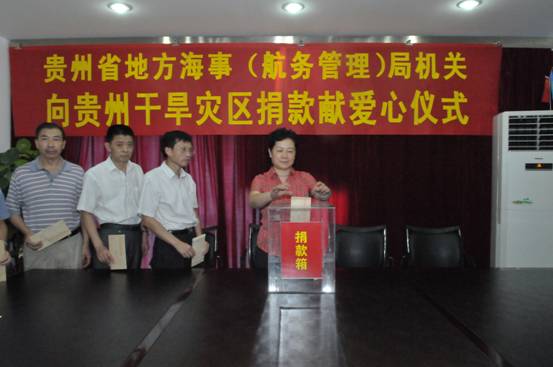 持续干旱,贵州大部分县市田土龟裂,庄稼颗粒不收,发生人畜饮水困难,省地方海事(航务管理)局党委响应厅党委的倡议,于9月7 日举行捐款献爱心仪式,动员机关广大干部自愿向干旱受灾地区捐款献爱心,所捐款交由厅转到干旱受灾地区。